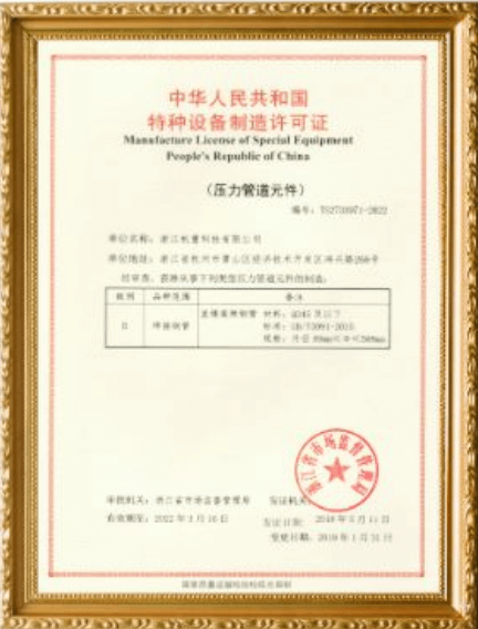 公司取得了壓力管道元件生產(chǎn)許可證